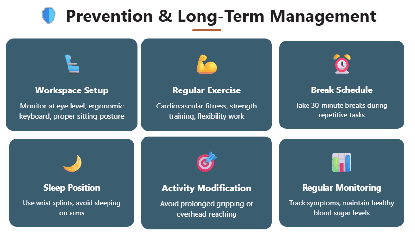 - Ergonomic adjustments: Maintain neutral wrist positions during activities